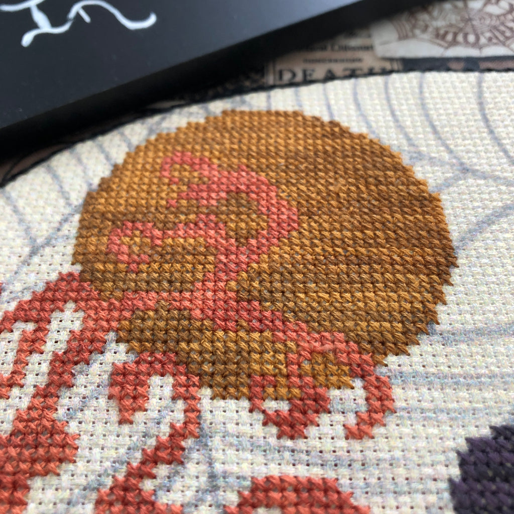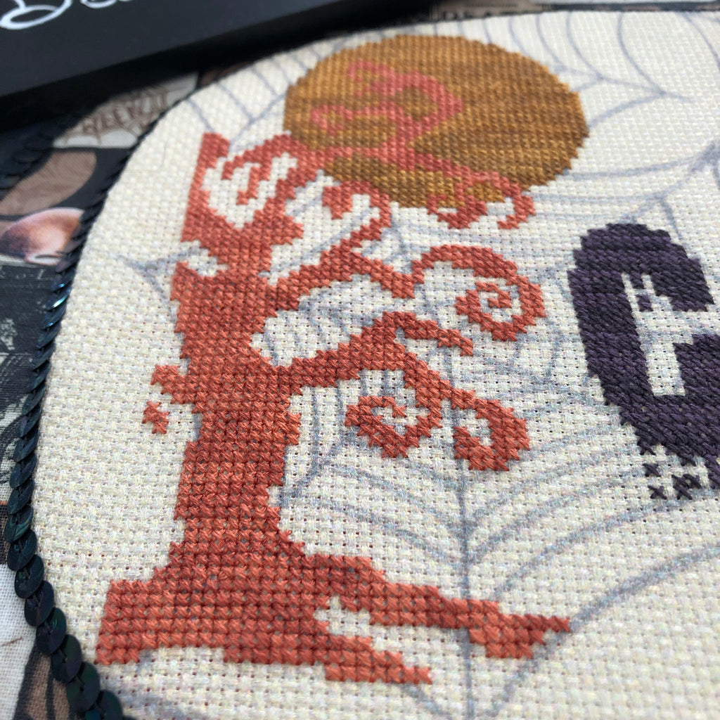 Model is stitched with 1 thread over 1 on 18 count Spider Webs by Fabric Flair.