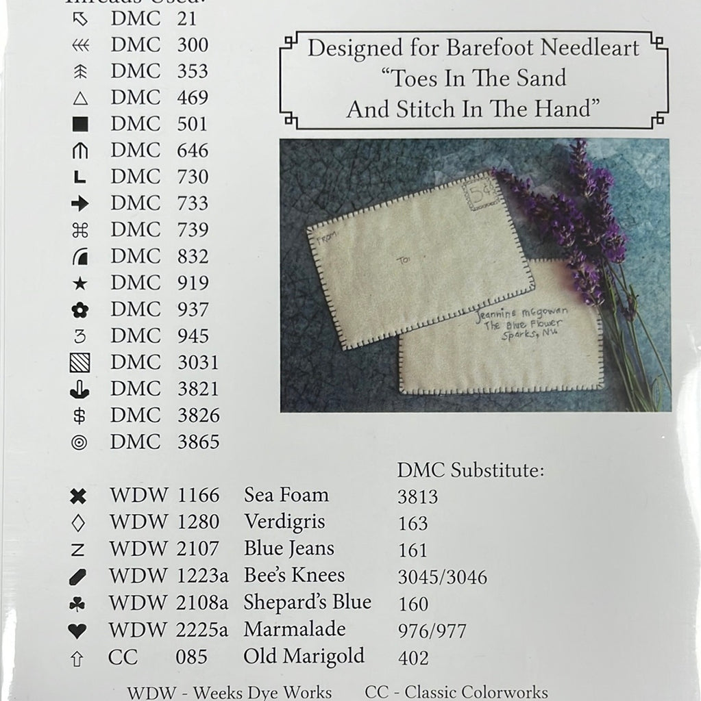 The model is stitched on 40 count "Water Green" linen from Zweigart. Stitch count is 173 wide x 80 high. Threads Used: DMC - 580, 632, 758, 779, 838, 840, 936, 945, 3863, 3864, 3865, Ecru Crescent Colors - Hazelnut Weeks Dye Works - Guacamole, Carrot, Clockwork, Bee's Knees The chart includes DMC options for the overdyed flosses. The linen is a light blue (close to DMC 927). |