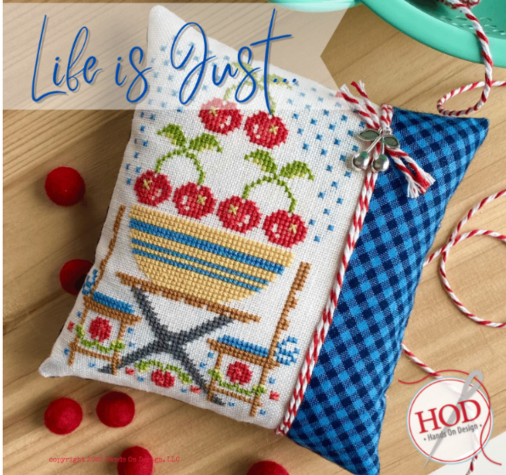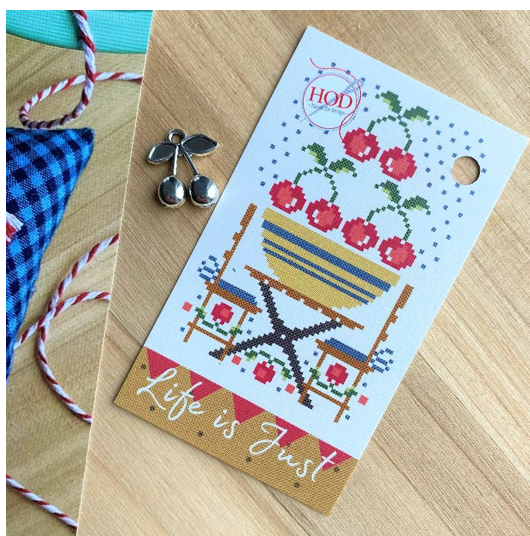 This sweet little stitch comes with a few bonuses... a cherry of a charm & custom thread card! You supply the wire closure or book ring to keep project threads tidy!