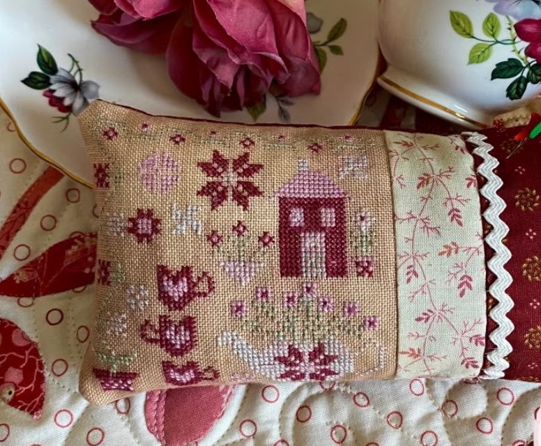 Tea Garden Pin Pillow - "Treenway Silks Tea Time Pallette XStitch the Rainbow" - Stitch count is 60w x 60h.