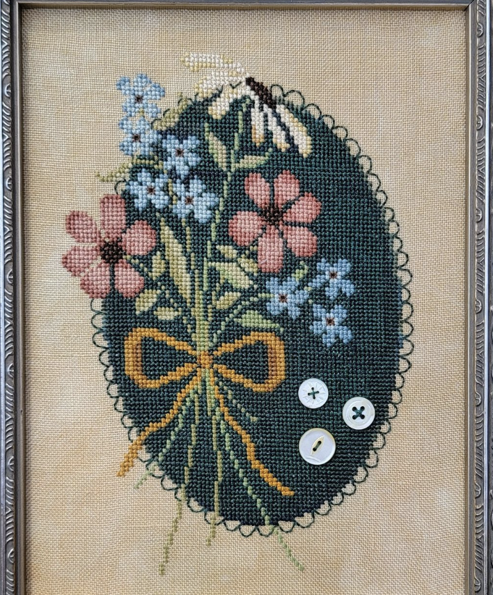 The model was stitched using two strands of thread over two threads of linen. It was completed using cross stitches, straight stitches, and eyelet stitches. Antique buttons were used to embellish.