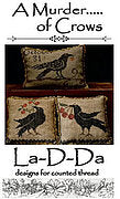 Model stitched over two using 32 Ct. Putty for the two smaller crows and 32 Ct. Copper Penny for the larger crow using DMC floss and Weeks Dye Works (or all DMC 310, 645, 921, 935, 3781, 3830, 3857). Also required but not listed above "Mossy" chenille trim from Lady Dot Creates (not included). Stitch count 60 x 60 for smaller pillows and 94 x 68 for the larger pillow.