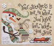 "Your greatness is not in what you have but what you give" Model stitched one over one on 18 Ct. Vintage Country Mocha Aida using DMC floss and Weeks Dye Works (or all DMC floss 310, 3857, 3052, 838, 754, 3362, 3830, 922, 920, 535, 07, 355, 03, B5200). Stitch Count: 115x96. Design Size: 6 3/8" x 5 3/8"