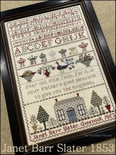 The Scarlet House, stitched on 40ct. Paperbark linen from Fox and Rabbit using Classic Colorworks Belle Soie: Rustique, Old Crow, Mer Bleu, Eiffel Tower, Petticoat Blue, Sweet Lavender, and Icing. Gloriana: Candy Apple Red, Lemon Thyme, Laquered Gold, Avonlea Green Stitch count is 168 x 259.