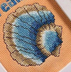 Model is stitched with 2 threads over 1 on 18 count Aida Summer Peach by Picture This Plus.
