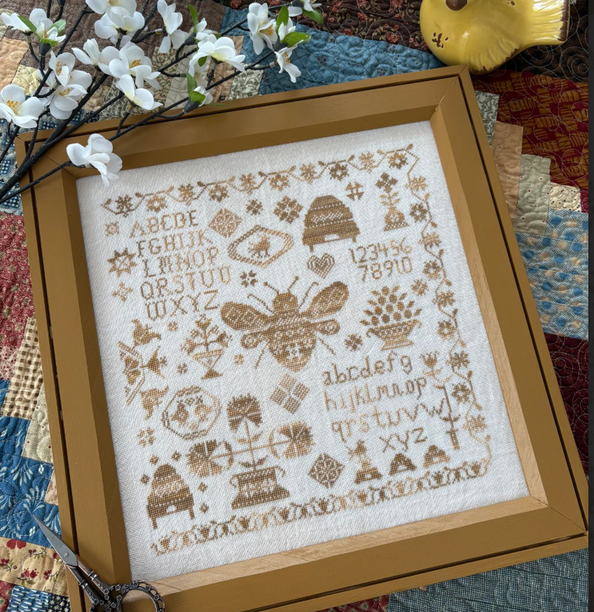 Honey Bee Sampler is stitched on 36 count Arrowroot linen by Roxy Floss Co., one strand of floss over two linen threads with the following floss: