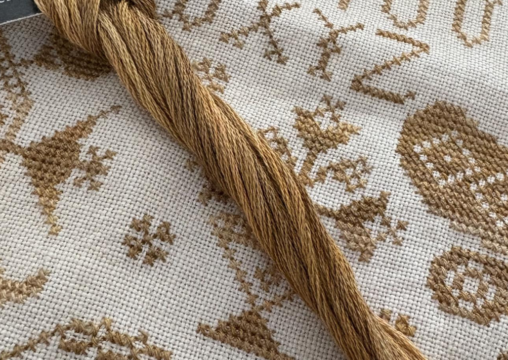 Creme Brulee by Roxy Floss Co. (8 yard skeins) - requires 3 skeins. However, if using 5 yard skeins, I would suggest 4 to be safe. If you are stitching with 2 strands, you will need double the amount of floss. Weeks Dye Works Chickpea or Belle Soie Pecan Pie are good alternatives to the Roxy Floss Co. Creme Brulee.
