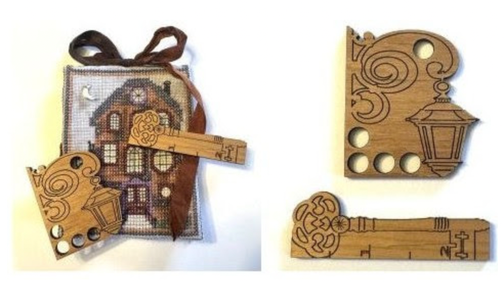 Kit includes everything needed to complete the design as well as a wooden ruler and thread keep. Of course the charms, beads, buttons and silk ribbon are included too! A true heirloom piece. Approximate size is 3" x 4".