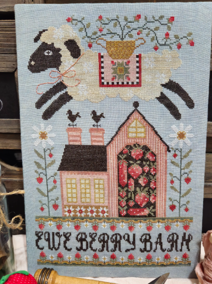 Model stitched on 36 count Eucalyptus by Fox and Rabbit using Classic Colorworks: Caroling, Crab Cakes, Ye Olde Gold, Brown Sugar, Blushing Beauty, Camouflage, Blackbird. The Gentle Art: Rag Doll, Otter Creek, Woodrose. Dmc: white