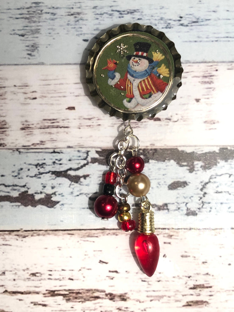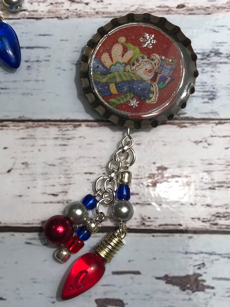 Vintage Christmas Dangles Bottle Cap Needle Minder are made of resin, bells and/or Christmas lights, and beads.