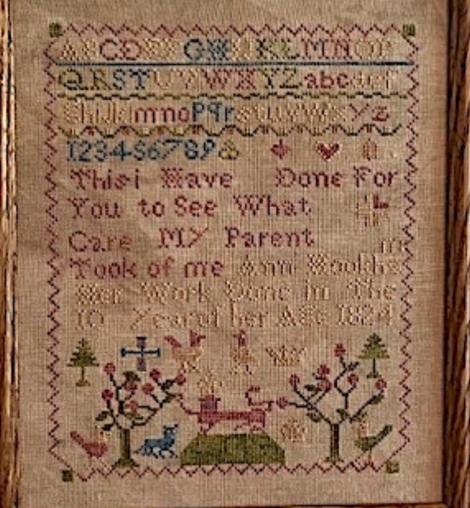 This is a primitive stitch added to the Willow Samplings line of designs.  It is very colorful and the verse is telling.  Ann was 10 years old in 1824 when she stitched her sampler.