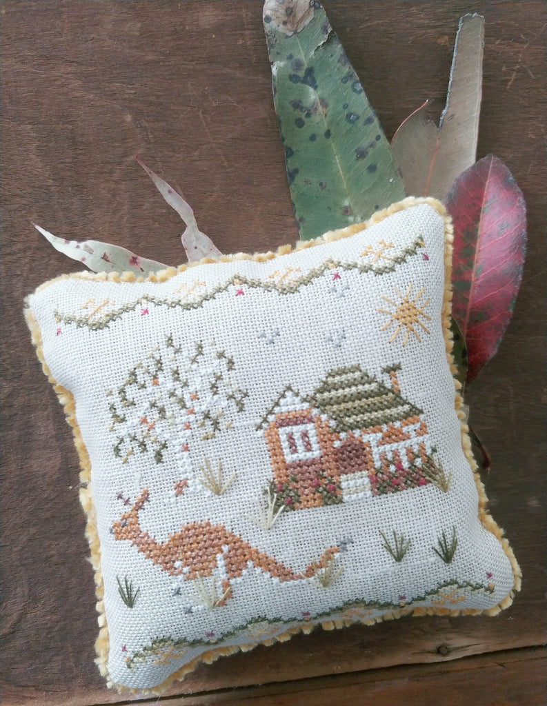 A start to a new, international series celebrating the wildlife with whom we share our environment. This little pin-pillow features a leaping Kangroo, set against a Federation-style home. It pairs with "Emu View" and more designs are to come. Previously a retreat exclusive.