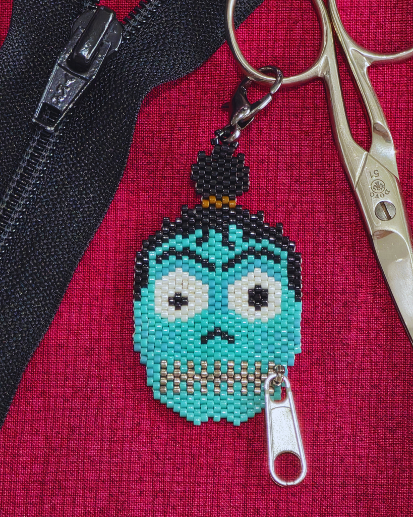 Kit comes with everything needed to create the design: beading thread, needles, delicas, zipper pull, lobster claw clasp, and instructions.