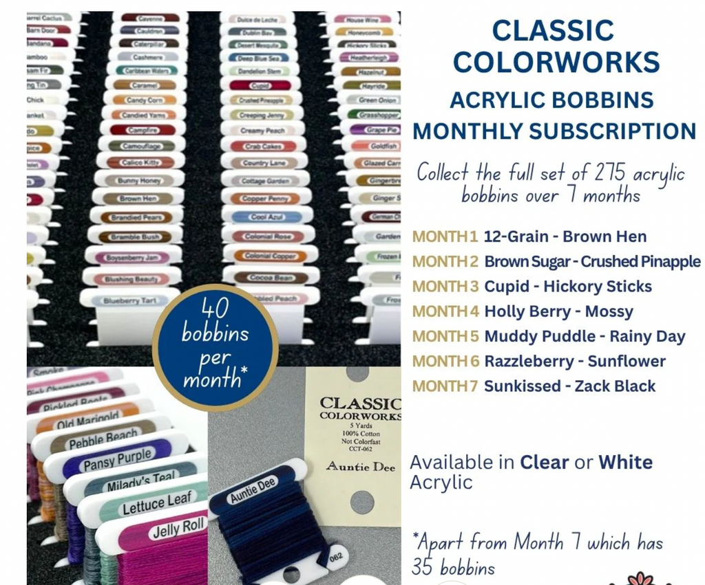 You’ll receive 40 white acrylic bobbins, each one pre-labelled with Classic Colorworks Names, numbers and color swatch. By the end of 7 months, you’ll own the full set— 275 beautifully organized bobbins. *the last month will have $35- unless more colors are released. If new colors are released these will be added to the subscription as well.