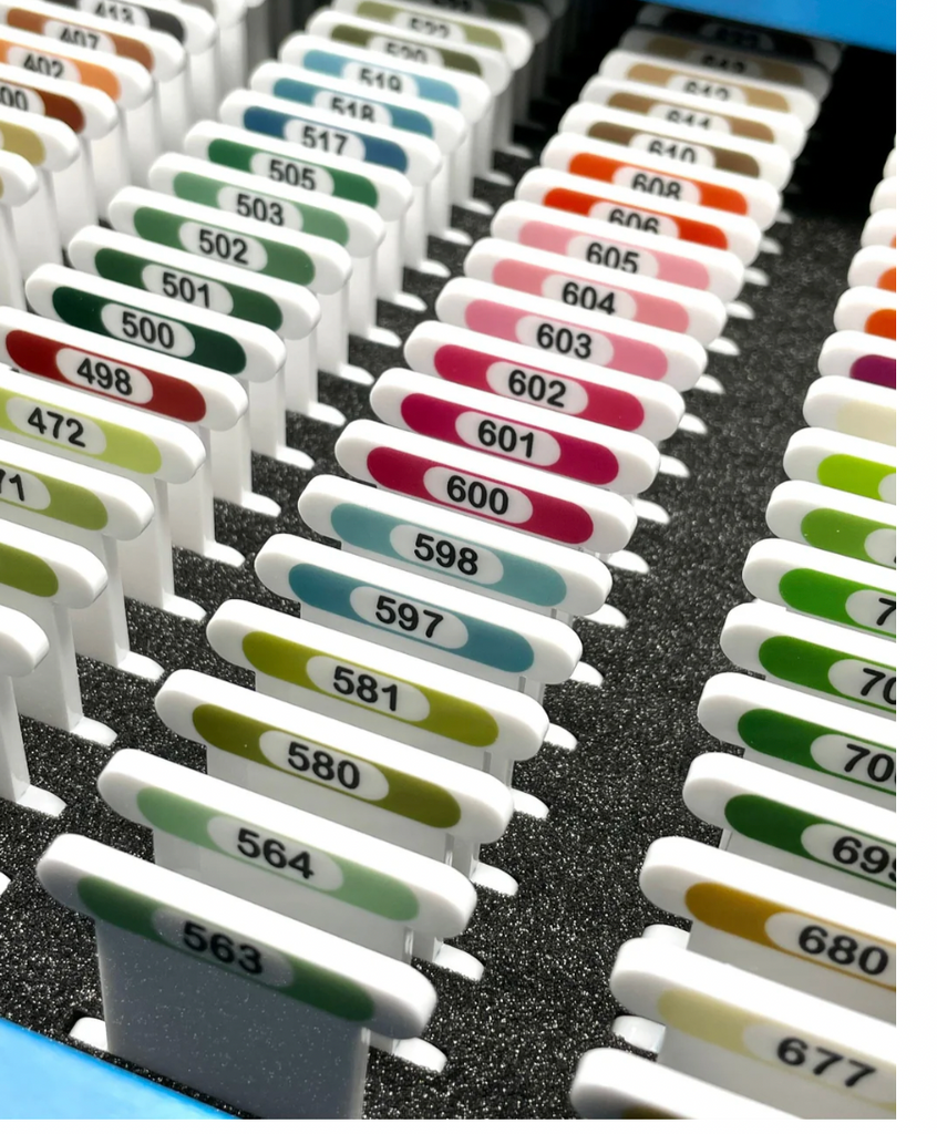 You’ll receive 42 of our signature acrylic bobbins, each one pre-labelled with DMC numbers and color swatch. By the end of 12 months, you’ll own the full set— 500 beautifully organized bobbins.