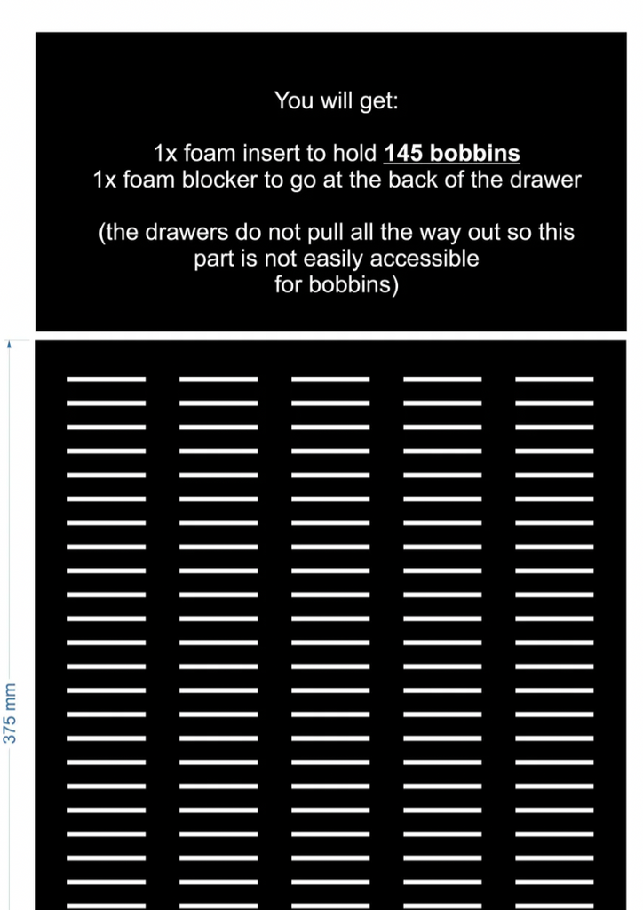 As the drawers do not pull all the way out there is an area at the back of the drawer which is not easily accessible. You will get a foam blocker to push to the back of the drawer and an insert for the bobbins to go in front.