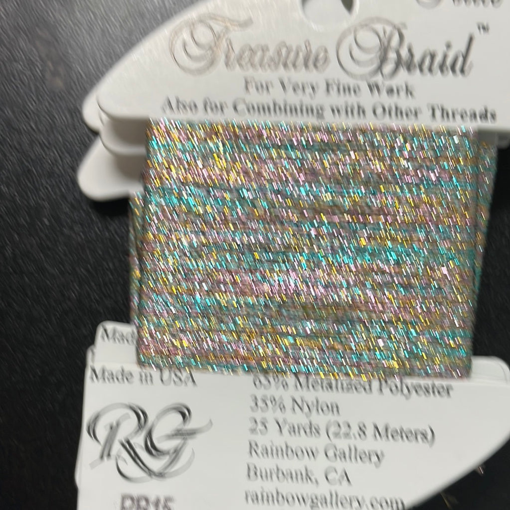 65% Rayon, 35% Metalized Polyester. 25 Yard Cards. Hand Washable, Test First. Made in Japan & USA. A 3-ply braided metallic, Treasure Braid Petite is for very fine work or to combine with other threads. Light coverage for 18 count but works great for Cross Stitch too.