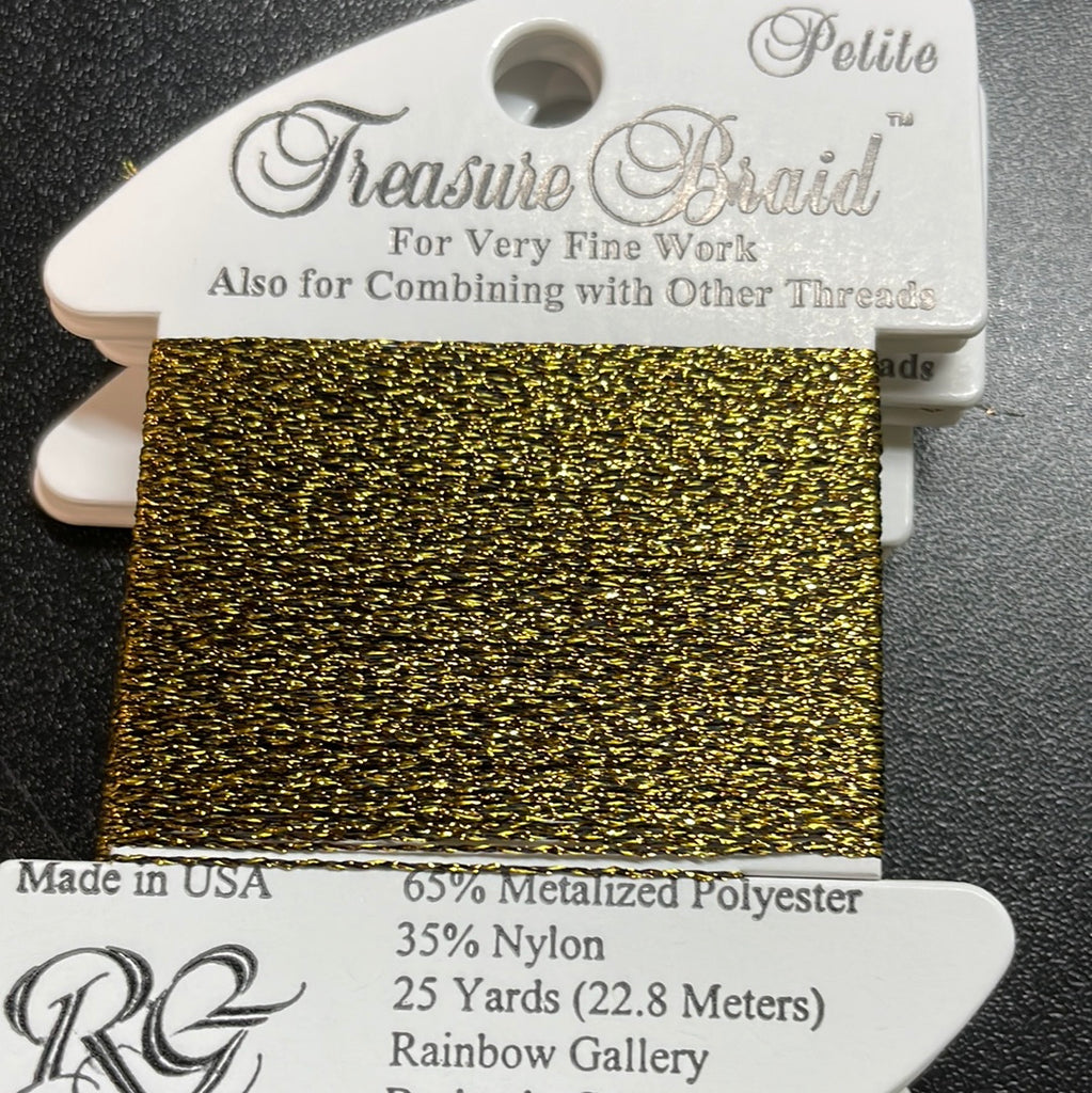 65% Rayon, 35% Metalized Polyester. 25 Yard Cards. Hand Washable, Test First. Made in Japan & USA. A 3-ply braided metallic, Treasure Braid Petite is for very fine work or to combine with other threads. Light coverage for 18 count but works great for Cross Stitch too.