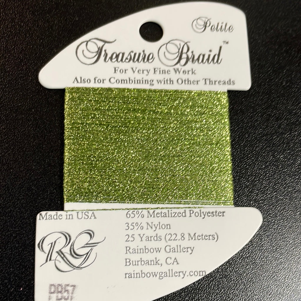 65% Rayon, 35% Metalized Polyester. 25 Yard Cards. Hand Washable, Test First. Made in Japan & USA. A 3-ply braided metallic, Treasure Braid Petite is for very fine work or to combine with other threads. Light coverage for 18 count but works great for Cross Stitch too.