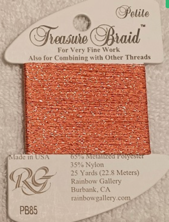 65% Rayon, 35% Metalized Polyester. 25 Yard Cards. Hand Washable, Test First. Made in Japan & USA. A 3-ply braided metallic, Treasure Braid Petite is for very fine work or to combine with other threads. Light coverage for 18 count but works great for Cross Stitch too.