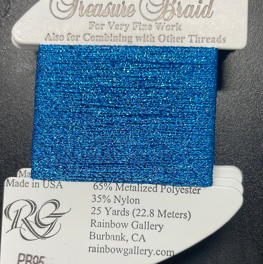 65% Rayon, 35% Metalized Polyester. 25 Yard Cards. Hand Washable, Test First. Made in Japan & USA. A 3-ply braided metallic, Treasure Braid Petite is for very fine work or to combine with other threads. Light coverage for 18 count but works great for Cross Stitch too.