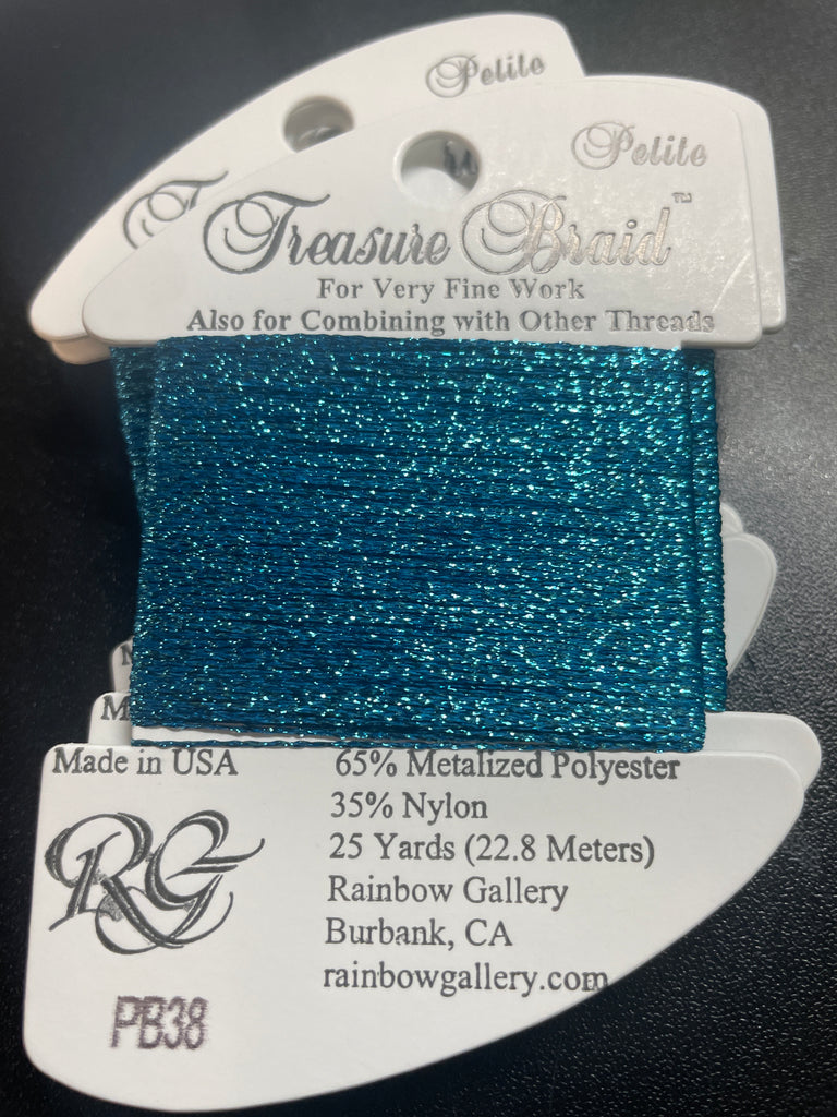 65% Rayon, 35% Metalized Polyester. 25 Yard Cards. Hand Washable, Test First. Made in Japan & USA. A 3-ply braided metallic, Treasure Braid Petite is for very fine work or to combine with other threads. Light coverage for 18 count but works great for Cross Stitch too.