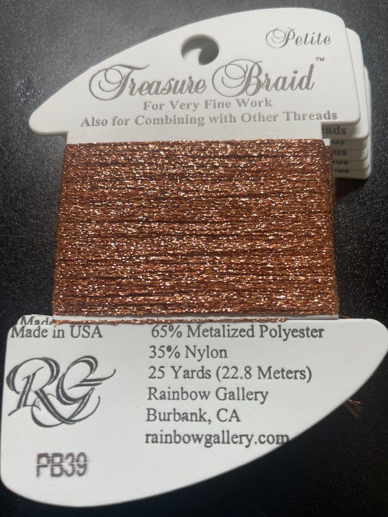 65% Rayon, 35% Metalized Polyester. 25 Yard Cards. Hand Washable, Test First. Made in Japan & USA. A 3-ply braided metallic, Treasure Braid Petite is for very fine work or to combine with other threads. Light coverage for 18 count but works great for Cross Stitch too.