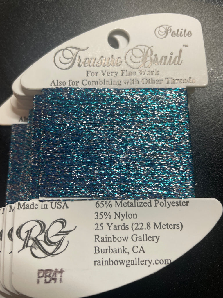 65% Rayon, 35% Metalized Polyester. 25 Yard Cards. Hand Washable, Test First. Made in Japan & USA. A 3-ply braided metallic, Treasure Braid Petite is for very fine work or to combine with other threads. Light coverage for 18 count but works great for Cross Stitch too.