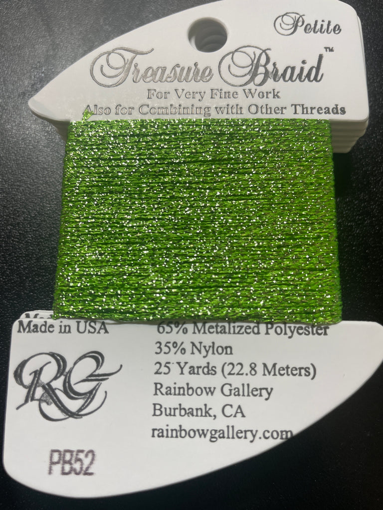 65% Rayon, 35% Metalized Polyester. 25 Yard Cards. Hand Washable, Test First. Made in Japan & USA. A 3-ply braided metallic, Treasure Braid Petite is for very fine work or to combine with other threads. Light coverage for 18 count but works great for Cross Stitch too.