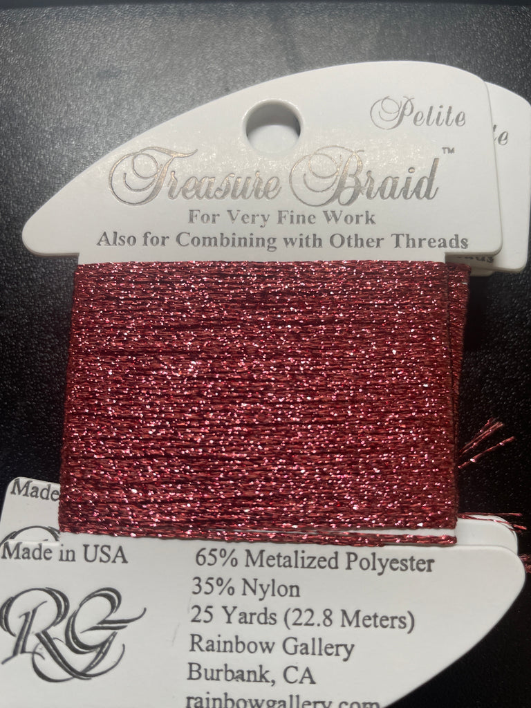 65% Rayon, 35% Metalized Polyester. 25 Yard Cards. Hand Washable, Test First. Made in Japan & USA. A 3-ply braided metallic, Treasure Braid Petite is for very fine work or to combine with other threads. Light coverage for 18 count but works great for Cross Stitch too.