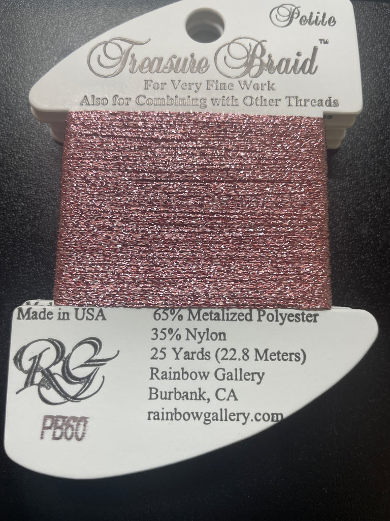 65% Rayon, 35% Metalized Polyester. 25 Yard Cards. Hand Washable, Test First. Made in Japan & USA. A 3-ply braided metallic, Treasure Braid Petite is for very fine work or to combine with other threads. Light coverage for 18 count but works great for Cross Stitch too.
