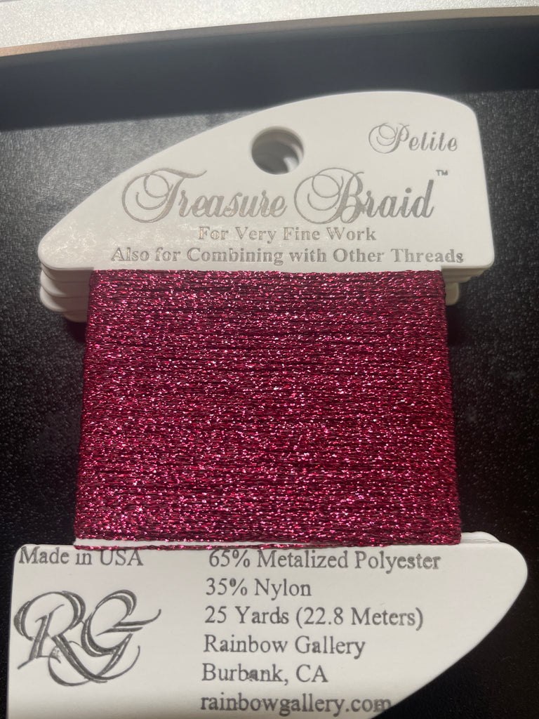 65% Rayon, 35% Metalized Polyester. 25 Yard Cards. Hand Washable, Test First. Made in Japan & USA. A 3-ply braided metallic, Treasure Braid Petite is for very fine work or to combine with other threads. Light coverage for 18 count but works great for Cross Stitch too.