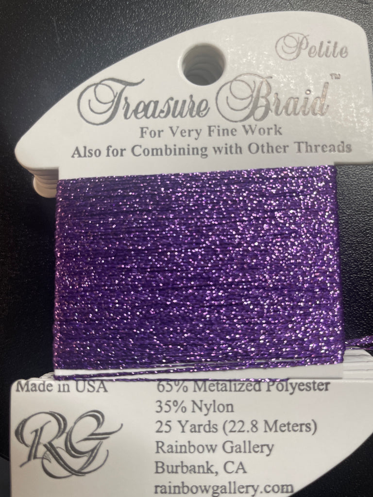 65% Rayon, 35% Metalized Polyester. 25 Yard Cards. Hand Washable, Test First. Made in Japan & USA. A 3-ply braided metallic, Treasure Braid Petite is for very fine work or to combine with other threads. Light coverage for 18 count but works great for Cross Stitch too.