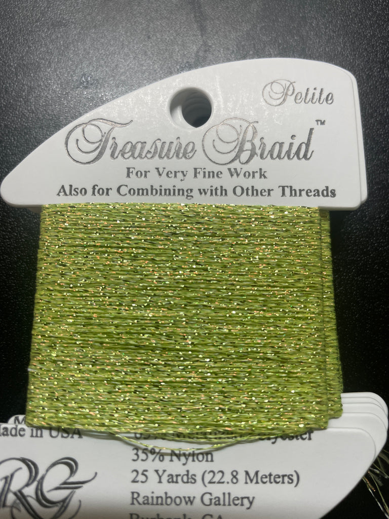 65% Rayon, 35% Metalized Polyester. 25 Yard Cards. Hand Washable, Test First. Made in Japan & USA. A 3-ply braided metallic, Treasure Braid Petite is for very fine work or to combine with other threads. Light coverage for 18 count but works great for Cross Stitch too.