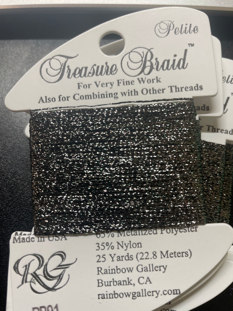 65% Rayon, 35% Metalized Polyester. 25 Yard Cards. Hand Washable, Test First. Made in Japan & USA. A 3-ply braided metallic, Treasure Braid Petite is for very fine work or to combine with other threads. Light coverage for 18 count but works great for Cross Stitch too.