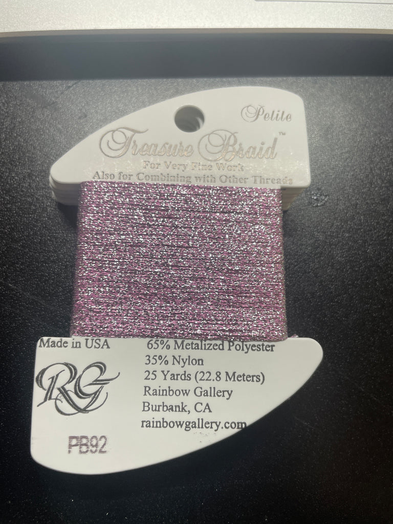 65% Rayon, 35% Metalized Polyester. 25 Yard Cards. Hand Washable, Test First. Made in Japan & USA. A 3-ply braided metallic, Treasure Braid Petite is for very fine work or to combine with other threads. Light coverage for 18 count but works great for Cross Stitch too.
