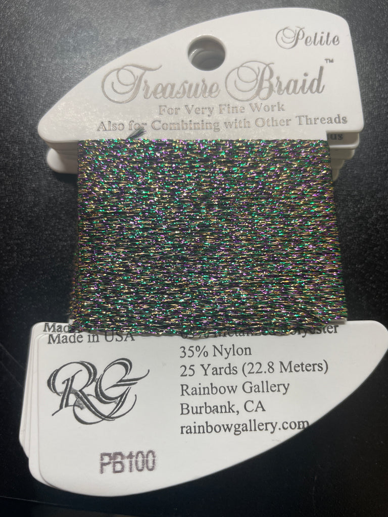 65% Rayon, 35% Metalized Polyester. 25 Yard Cards. Hand Washable, Test First. Made in Japan & USA. A 3-ply braided metallic, Treasure Braid Petite is for very fine work or to combine with other threads. Light coverage for 18 count but works great for Cross Stitch too.