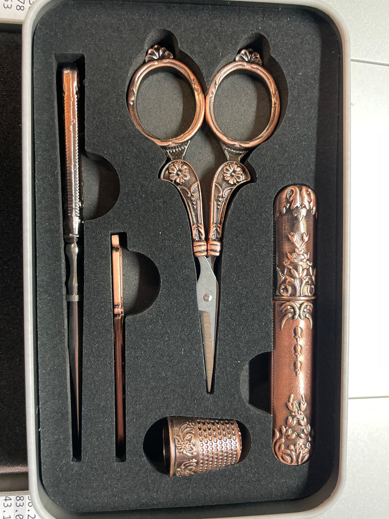 thimble, awl, scissors, threading needle and syringe in a storage tin