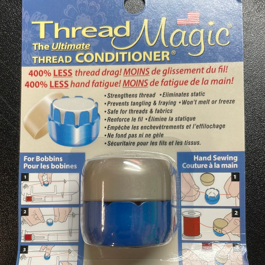 Thread Magic is a thread conditioner. Designed to make thread stronger and more manageable. It reduces friction when sewing, protects against UV rays, mold and mildew, and helps reduce tangling and knotting. Thread Magic can be used for hand or machine sewing. Includes thread cutter blade and no-lose lid. Acid-free and non-toxic.