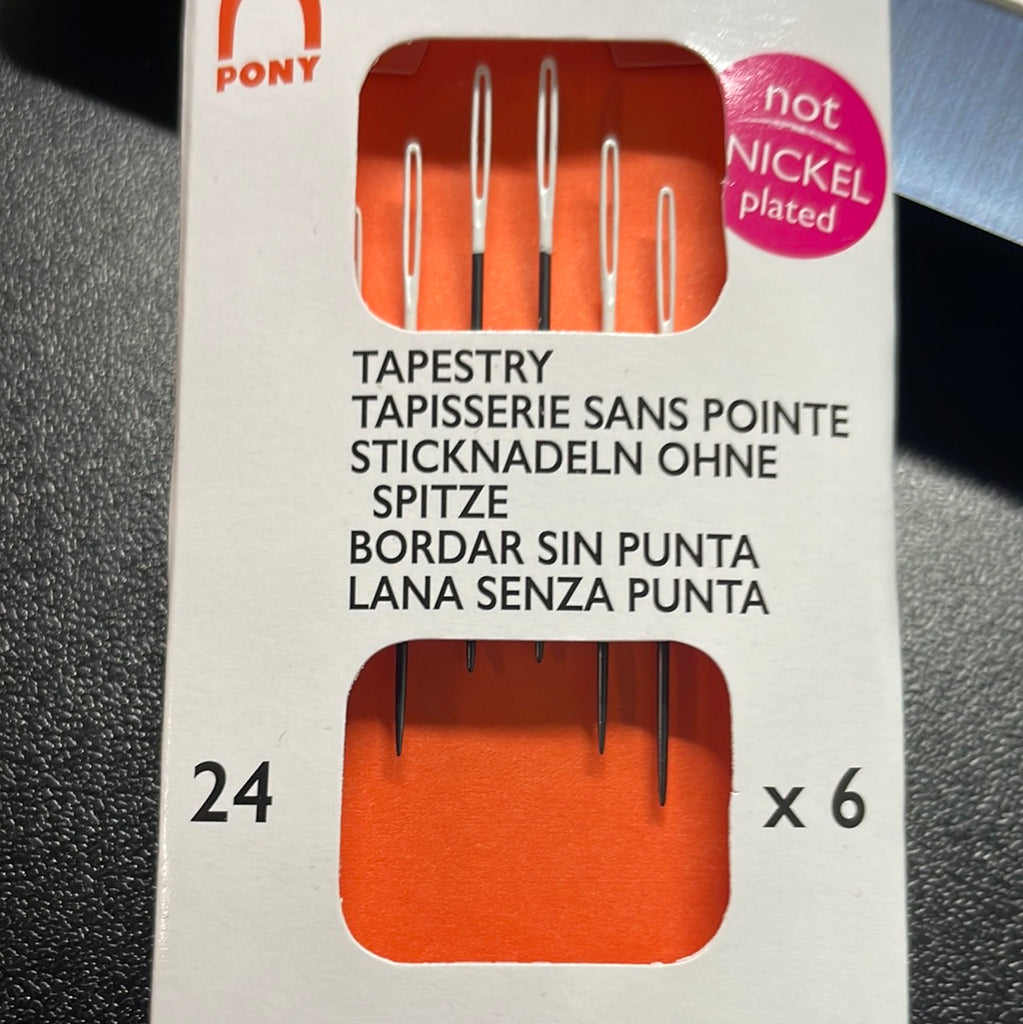 Pony all Black needles in size 24. Needles have a white eye to make threading easier. 6 needles per pack
