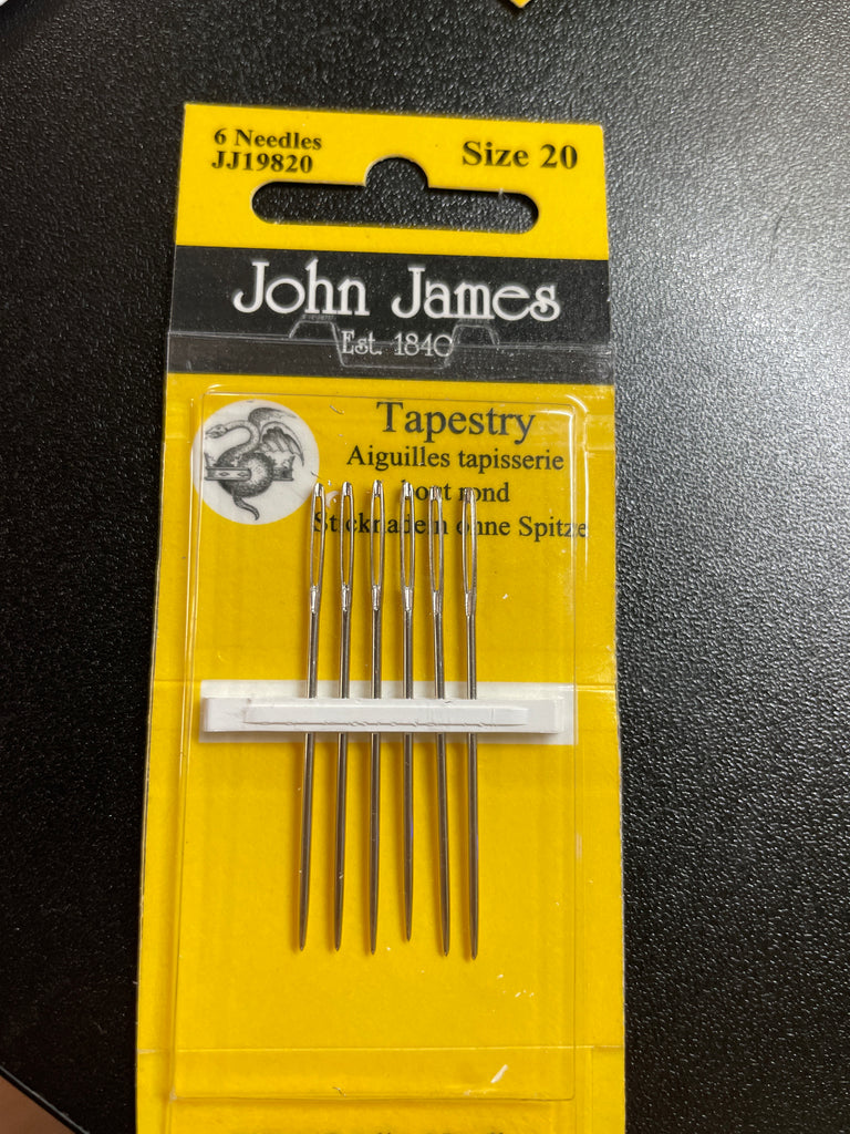 John James Tapestry Needles are essential for cross stitch and embroidery and excellent for crafting. They feature a round, blunt point that easily slips between floss strands and fabrics without splitting or tearing. The package includes six, size 20 needles