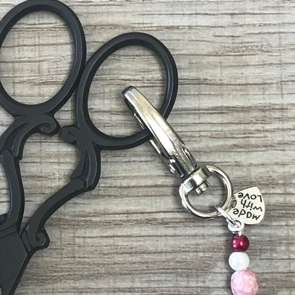 I have used a mix of glass beads to make this scissor Fob. The scissor fob can fit any size pair of scissors. They are approximately 3 1/2 inches long including the clasp. Long enough to be able to keep track of your scissors but not so long that it interferes with using them.