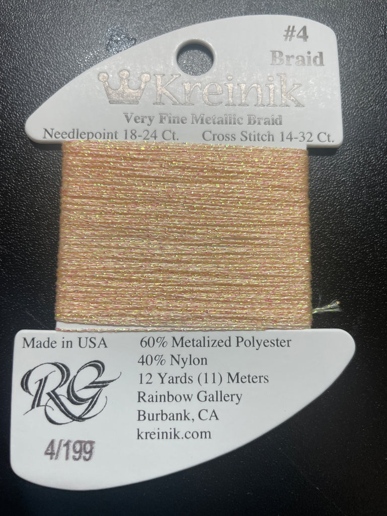 This is the premier metallic thread for cross stitching because it is so soft and easy to use. Stitch with Very Fine (#4) Braid in Cross Stitch (16-18 ct) and Needlepoint (for light details on 18-30 ct). It's also nice and thin for Machine Embroidery, Scrapbooking and Card Making embellishments.