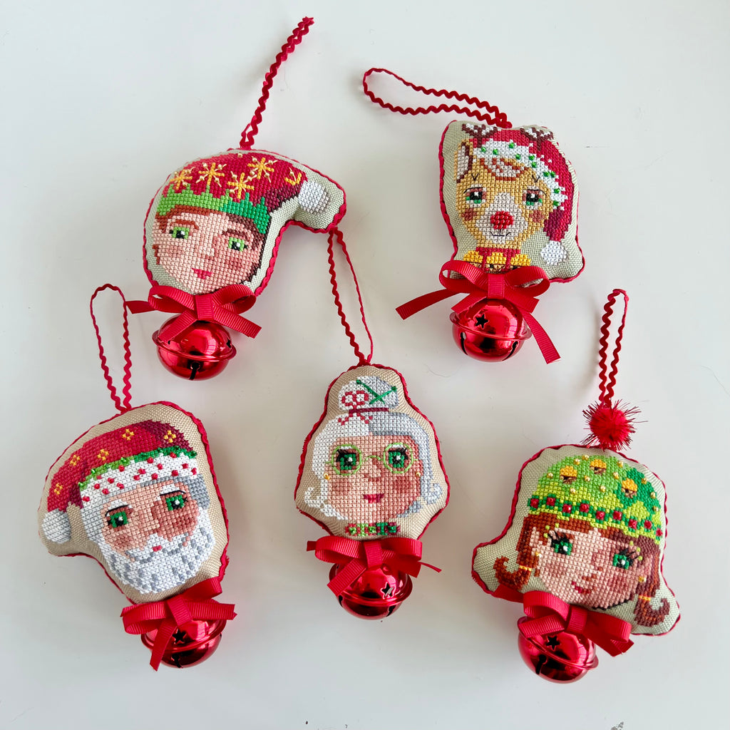 Set of Five holiday ornament patterns in one chart: Santa, Mrs. Claus, Rudolf, Elf and Elfa. This marks the start of an annual ornament tradition.