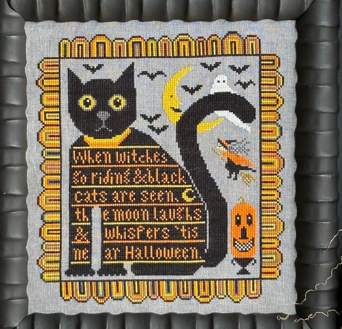 This piece is stitched on 40-Count Ancient Ruin from Fox & Rabbit using Needlepoint Silks. The stitch count is 131 Wide by 145 High.