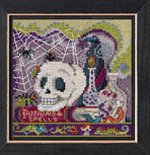This Halloween design has glass jars, a skull, spiderwebs, witch's hat and a book with "Potions & Spells." Kit Includes: Beads, ceramic button, perforated paper, floss, needles, chart and instructions. Finished Size: 5.25" x 5.25".