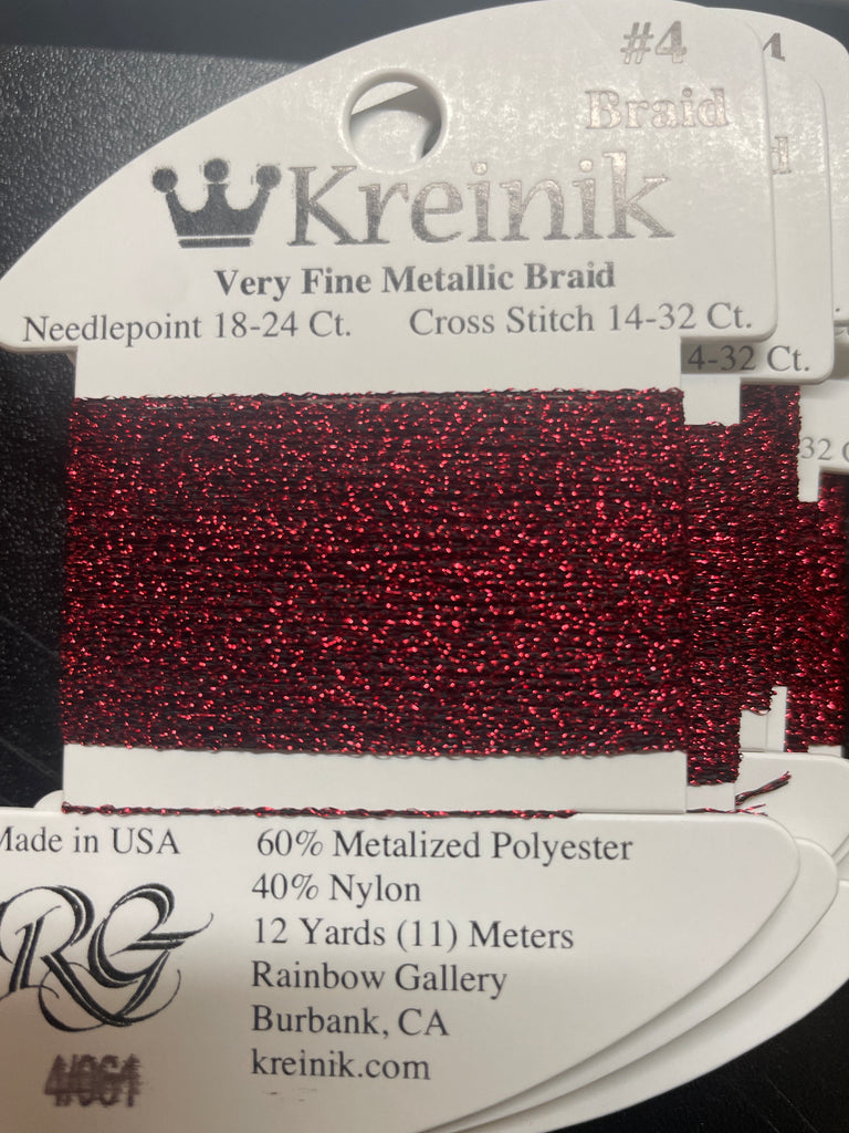 This is the premier metallic thread for cross stitching because it is so soft and easy to use. Stitch with Very Fine (#4) Braid in Cross Stitch (16-18 ct) and Needlepoint (for light details on 18-30 ct). It's also nice and thin for Machine Embroidery, Scrapbooking and Card Making embellishments.