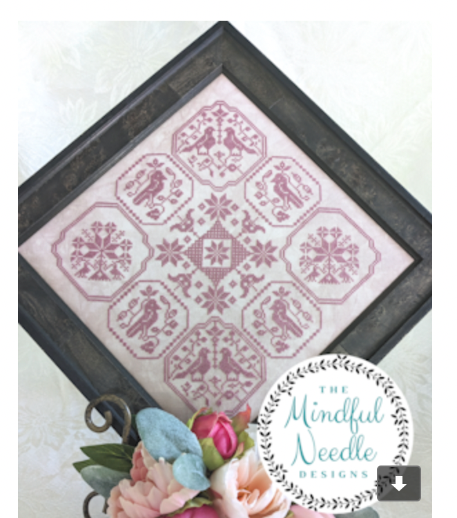 Featuring lovely traditional Quaker motifs, the Quaker Birds design was worked on #32 Lugana, color Antique Market from Be Stitch Me Fabrics. It was stitched using beautiful Treenway Silks Harmony #223. You will need almost 4 entire skiens and a 5th is recommended to ensure you will have enough. DMC substitution provided.