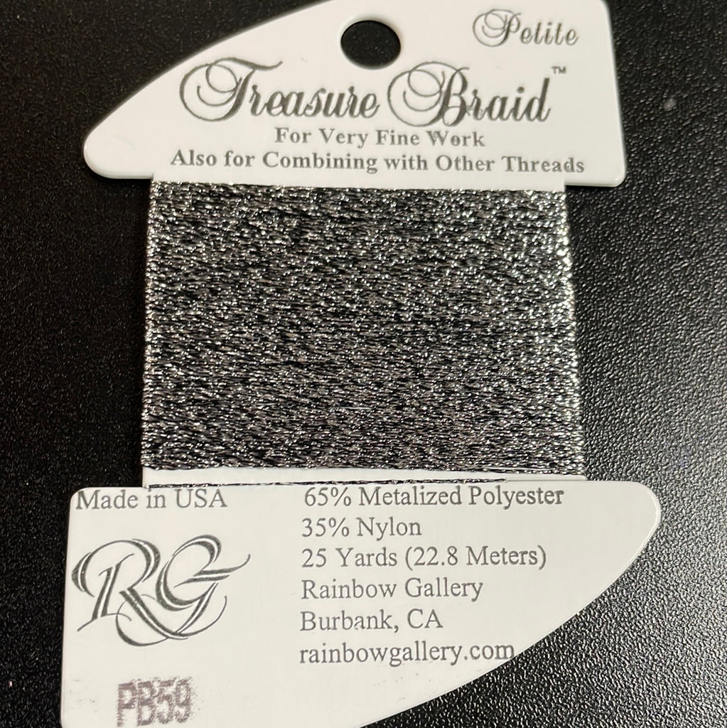 65% Rayon, 35% Metalized Polyester. 25 Yard Cards. Hand Washable, Test First. Made in Japan & USA. A 3-ply braided metallic, Treasure Braid Petite is for very fine work or to combine with other threads. Light coverage for 18 count but works great for Cross Stitch too.
