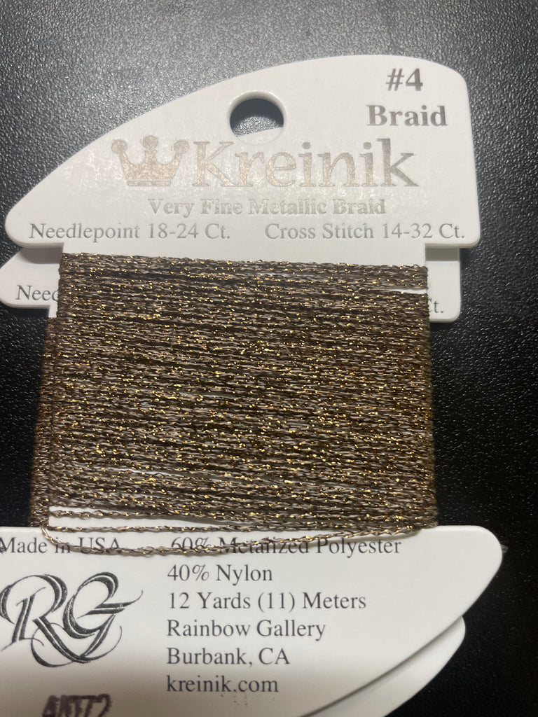 This is the premier metallic thread for cross stitching because it is so soft and easy to use. Stitch with Very Fine (#4) Braid in Cross Stitch (16-18 ct) and Needlepoint (for light details on 18-30 ct). It's also nice and thin for Machine Embroidery, Scrapbooking and Card Making embellishments.